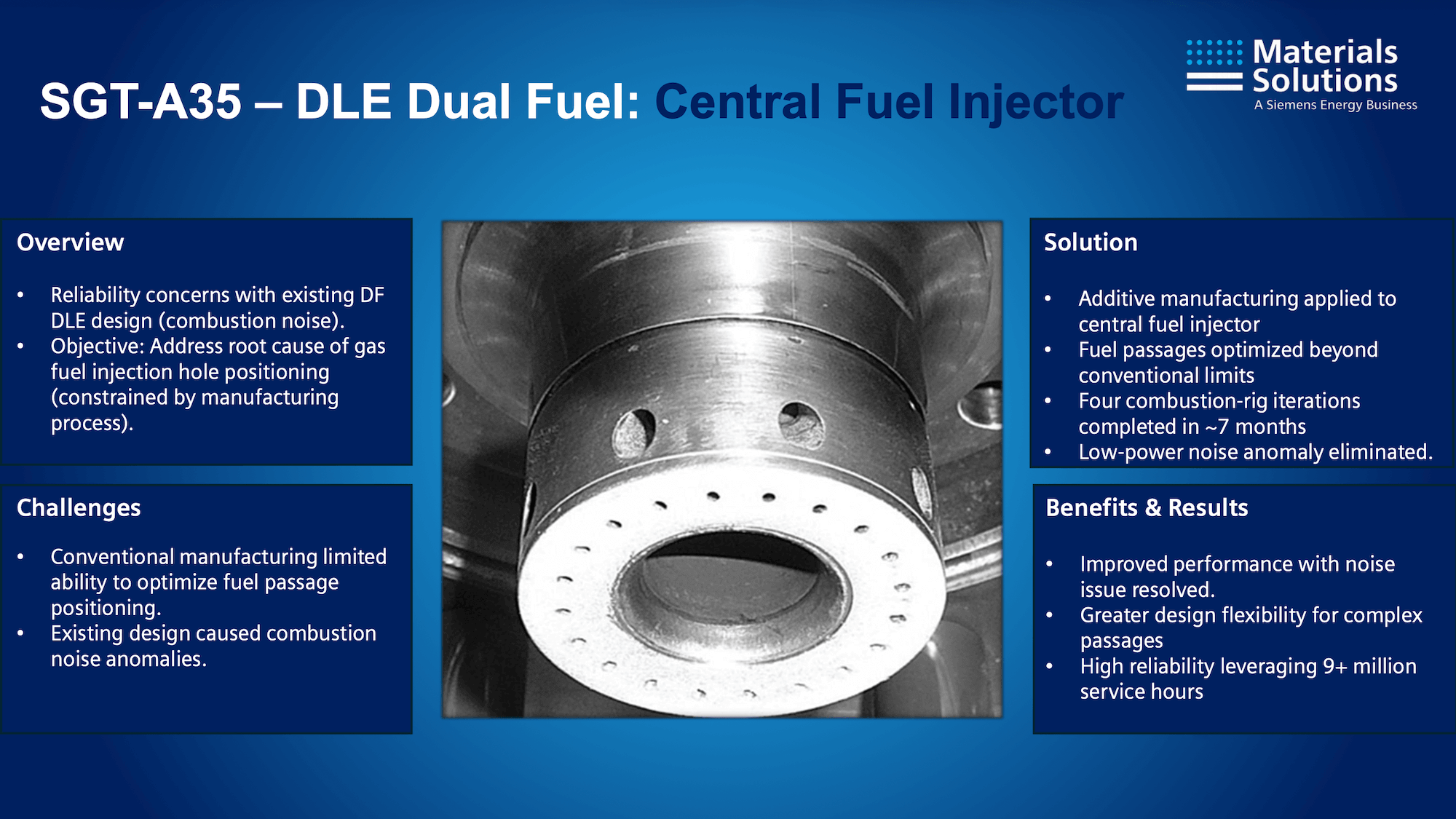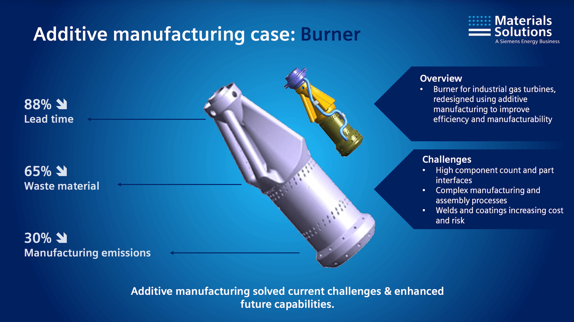 Today, our AM capabilities go beyond prototyping; we’re actively engaged in serial production of complex parts like turbo housings, burner nozzles, and turbine vanes, which have drastically improved lead times and provided previously unattainable levels of performance. We use advanced solutions for power generation assets to reduce scrap and increase the sustainability of Siemens Energy parts.